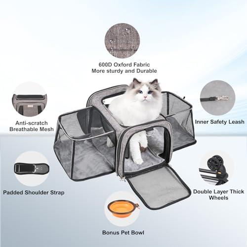 EXPANDABLE Rolling DOG CARRIER: The cat carrier with wheels can be extended on both sides to provide a spacious and more comfortable space. Design 3 large entrances with best ventilation and wide view.