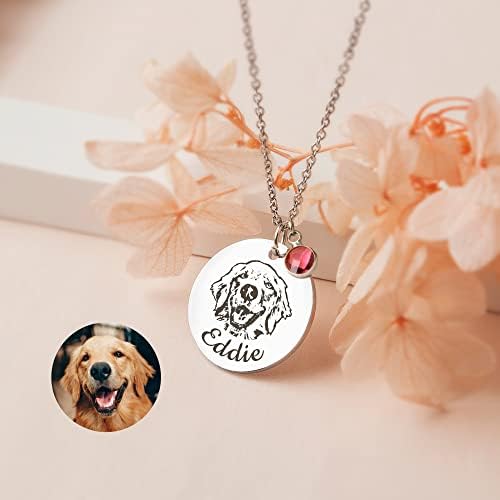 Anavia Personalized Pet Portrait Necklace, 12 Month of Birthstone Charm Options, Handmade Photo Custom Pet Memorial Jewelry Gift for Women Girls, Round Disc Coin Necklace for Dog Cat Lovers