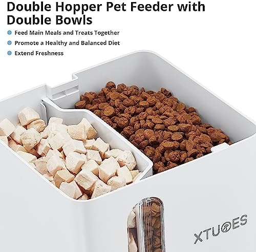 A healthy and regular diet is necessary for your pet.XTUOES is a dual-compartment automatic feeder that allows you to independently customize the amount of food in each compartment, creating a healthy and regular feeding plan for your pet. You can also choose to put food in both compartments simultaneously, allowing for a flexible and balanced meal plan tailored to your pet’s nutritional needs.