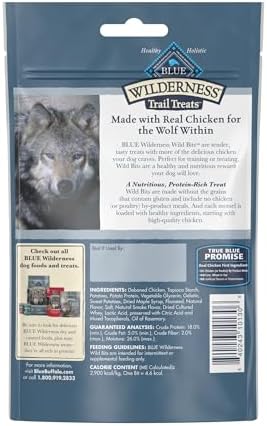 Contains one (1) 4-oz bag of BLUE Wilderness Trail Treats Wild Bits High Protein Grain Free Soft-Moist Training Dog Treats, Chicken Recipe