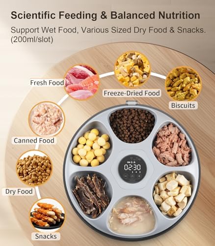 【Never Compromise on Your Pet’s Nutrition】Casfuy automatic dog feeder features 6 separate food compartments, ensuring precise portions for your pet. It accommodates not only kibbles but also wet, moist, various sized dry foods, and even snacks, supporting a balanced and scientific diet. To retain the freshness of wet/semi-moist/fresh foods, it comes with 4 reusable ice packs. These ice packs stay frozen for 6-8 hours and can keep wet food fresh for up to 24 hours.