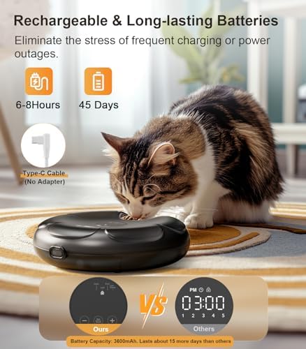 【Cordless, Rechargable & Long-lasting】The auto cat feeder measures 12.6’’x12.9’’x3.4’’. With built-in rechargeable batteries, you can conveniently place the feeder anywhere in your home without worrying about tangled cords or restricted placement once it’s fully charged. The upgraded program enables a full charge to last about 15 more days compared to models with same battery capacity, eliminating the stress of frequent charging or power outages. (A Type-C charging cable is included; the adapter is not provided. Simply connect it to a 5V 1~2A adapter /outlet)
