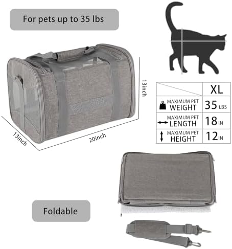 【PRODUCT DIMENSIONS】: Pet travel carrier size : 20x13x13 inches, recommended up to 35 lb pets, it is suitable for large, medium cats and small dogs. Please don’t choose your airline cat carrying case based on weight—please refer to your pet’s length and height when choosing a pet carrier size.