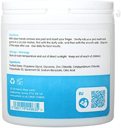 Usage instructions – Gently rub your pets teeth and gums in a circular motion, first with the dotty side, and then with the smooth side. Dispose of the wipe after use. For best results, we would recommend to use the wipes 1-2 times a week.