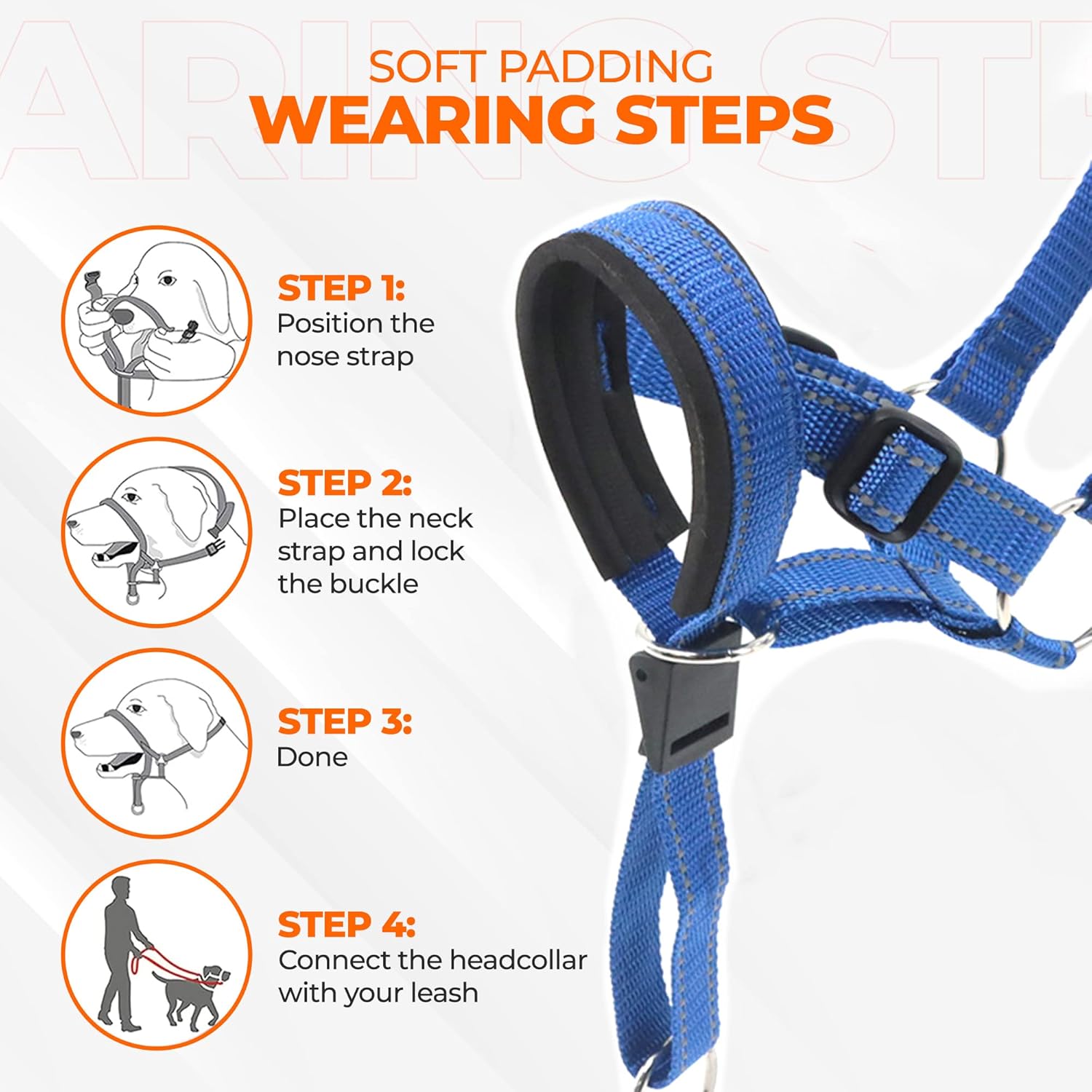 Dog Head Halter with Safety Strap – Gentle Leader Headcollar – No-Pull Dog Collar – Perfect for Leash & Harness TrainingHead halters are commonly used as an alternative to neck control collars. The head halter has a strap that encircles the snout, and where the nose goes the body follows. The headcollar makes control easier, requiring less physical effort, so you don’t end up battling with your pet when going for a walk.The safety clip is made of high-grade metal. The color of the clip is Rose Gold, rather than the traditional color. This part can provide strong front control. You can stop the dog from pulling by controlling the direction of the dog from the head.Reinforced fabric and webbing are more durable than other regular head collars. It is strong enough for heavy pullers, such as German Shepherd, Labrador, Husky, Bull Terrier, or other aggressive dogs.Without wearing head collars dogs that pull on the leash may also be at greater risk of becoming aggressive to strangers or dogs that they meet on walks if they are punished or choked each time they meet a new person or animal.