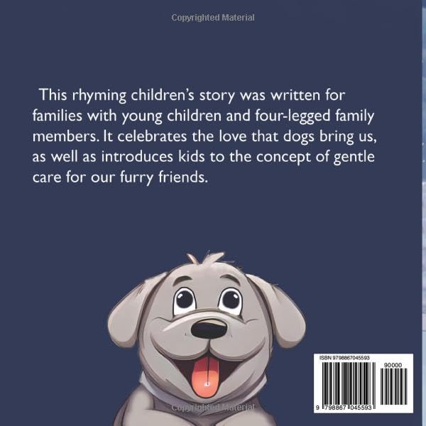 This rhyming children’s story was written for pet parents and parents of human kids. The colorful illustrations celebrates the love that dogs give us, as well as introduces your little humans to the concept of gentle care for our furry friends.