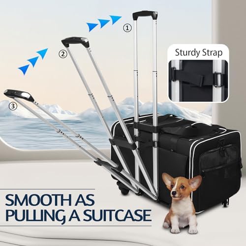 【FLEXIBLE WHEELS AND MULTIPLE CARRY WAYS】The carrier has 4 high quality 360° swivel wheels that allow the rolling two cat carrier to travel smoothly and comfortably on uneven surfaces or grassy areas. The handle of rolling pet carrier is designed like a suitcase, the wheels and the entire handle frame are removable from the dog carrier so you can not only use the pet carrier with wheels like a suitcase, but also as a shoulder bag or a handbag.