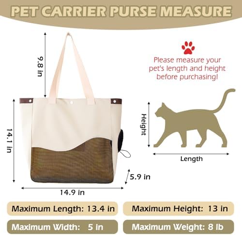 Fhiny Cat Purse Carrier, Small Dog Carrier Tote Breathable Mesh Pet Carrier Bag Soft Sided Adjustable & Foldable Kitten Travel Bag for Cats Kittens Rabbits Small Dogs Shopping Travel (Beige)