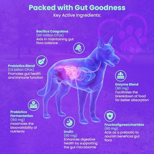 Boost Immune System Function. Increase energy levels , Optimized digestive process , Assistance with bowel movements , gas, belly discomfort , loose stools and diarrhea. Dog digestive support enzymes and assist with healthy vitamin absorption from food.