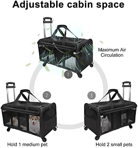 [Overall Size & Durable:] Double-Compartment design can hold two small pets,or fit one small to medium sized pet by removing the divider,realizing double-Compartment and single-Compartment free switching in a few seconds.The Double-Compartment pet rolling carrier can hold two 18-pound pets or one 35-pound pet.Soft-sided pet rolling carrier is made of durable cation linen and high grade polyester,anti-scratch.(Add:It may not meet the requirements of airline due to the large size)