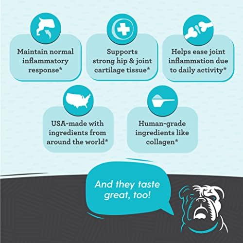 ✓ PREMIUM HIP & JOINT SUPPORT –Vets recommend our Dog Hip and Joint supplements for dogs because its unique premium ingredients focus on supporting joint, cartilage, connective tissue, muscle health and help support a healthy inflammatory response. Each chew includes high strength Glucosamine HCl, Chondroitin Sulfate, Flaxseed for Omega 3, Collagen, MSM, Turmeric, Hyaluronic Acid, Vitamin C and E. This put the spring back in the step of Hugo our English Bulldog and is suitable for all breeds.