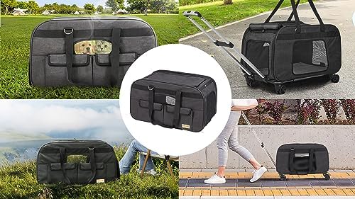 Large Dog Cat Carrier with Wheels for upto 35lbs, Rolling Pet Carrier with Detachable Rod Platform and Upgraded Wheels, Foldable Dog Travel Carrier with Detachable Trolley&Upgraded Wheels, Black