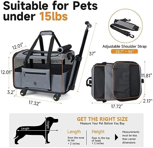 Pet Carrier Airline Approved: This cat carrier with wheels meets the standards of most airlines and can fit under the front cabin seat ( Please check the size with airline in advance). Dog carrier size: 17.32”L x 12”W x 12″H (without wheels). Recommend for pets under 15 lbs.
