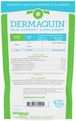 Helps Support Pet’s Defenses Against Allergens & Sensitive Skin: Dermaquin helps to fortify the skin’s natural barrier making it more difficult for allergens like pollen and dust mites to cause irritation