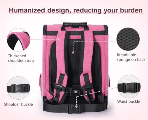 🐾 【 ERGONOMIC DESIGN 】: The widened & padded shoulder straps and back provide support and help reduce load and increase comfort. 2 retractable buckles on the top and bottom of the cat backpack to prevent shoulder strap deviation and maintain the stability of the dog carrier.