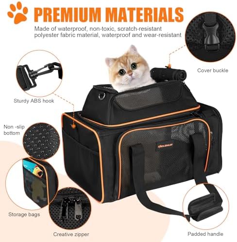 😻Perfectly Practical And Breathable -Airline approved pet carrier has 4 mesh vents and a retractable top to give your cat a wider space to breathe, allowing your pet to look out and interact with your pet;The base comes with a cushion, and there is a complimentary garbage bag for pet poop, with a safety zipper to keep your pet safe.Let you and your pet have a wonderful trip.