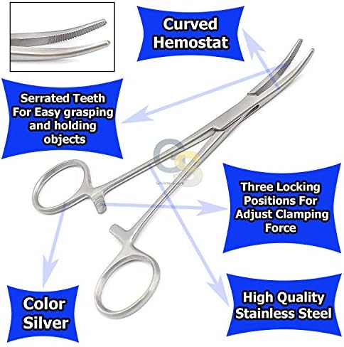 [Fishing Hemostats Easy to Handle]: Anti slip handle and ergonomic design of this helpful ear hair clean tweezers, hemostat forceps is easy to handle and grip, specially designed curved tip ends for easier reach; These hemostat clamps and hemostats curved forceps can be held in place by a locking forceps mechanism with three interlocking teeth that allow users to adjust the clamping force