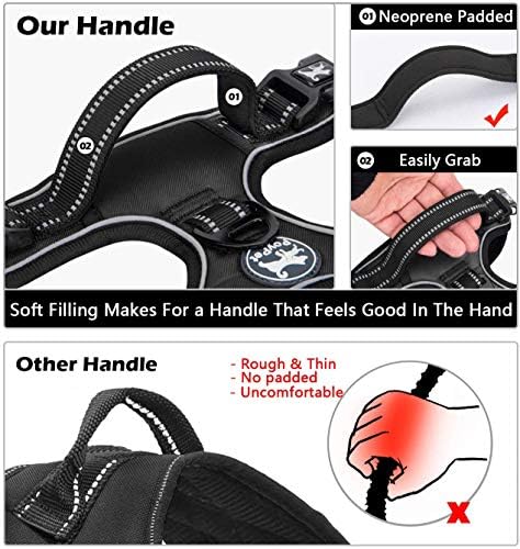 COMFY PADDED HANDLE: There’s a soft handle on the top of the harness, you can grab it and keep control of dogs when they go crazy or when they need help. It can restrain dogs easily and also perfect for walking them up steps, stairs and cars,etc. The soft handle of the leash keeps your hand protected from tugs and pulls, prevents chafing, and gives you more control while you walk!
