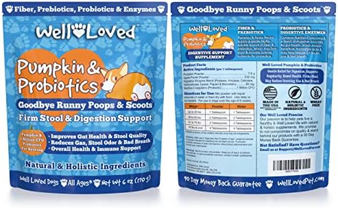 Well Loved Pumpkin for Dogs is an advanced formula with prebiotics, fiber, probiotic for dogs and digestive enzymes. High in fiber with pumpkin powder for dogs and apple pectin to prevent and relieve dog diarrhea, constipation, upset stomach, bloating, gas, firms up loose poop and supports digestive regularity and gut health.