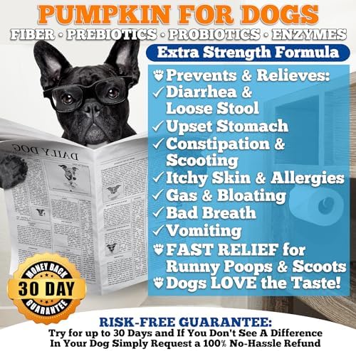 𝐑𝐈𝐒𝐊-𝐅𝐑𝐄𝐄 – Try our Pumpkin and Probiotics for 30 days and if you don’t see a difference in your dog simply request a 100% no-hassle refund.