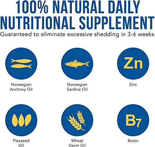 Scientifically formulated by a Ph.D. in Animal Nutrition, Shed-X daily liquid supplement for dogs provides Omega 3 and 6 fatty acids, vitamins, and minerals essential to healthy coats. With fish oil for dogs from Norwegian anchovies and sardines, organic flaxseed oil, natural wheat germ oil, Zinc, Biotin, and a delicious all-natural chicken flavor, this shedding supplement for dogs actively works from the inside out to help reduce unwanted shedding.