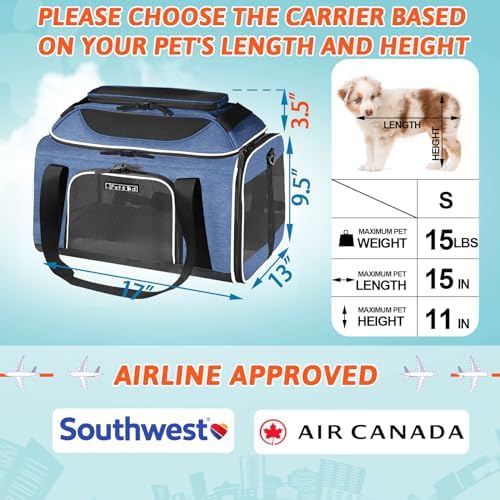 Top-Expandable Pet Carrier 17x13x9.5 Inches Southwest Airline Approved, Soft-Sided Carrier for Small Cats and Dogs with Locking Safety Zippers and Anti-Scratch Mesh(Blue)