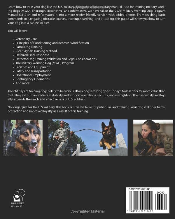 Large 8×10″ book format. Learn how to train your dog like the U.S. military. This is the official military manual used for training military working dogs (MWD). Thorough, descriptive, and informative, we have taken the USAF Military Working Dog Program Manual (31-219) and reformatted it into a more reader-friendly version with added photos. From teaching basic commands to navigating obstacle courses, tracking, searching, and attacking, this guide will show you how to turn your dog into a canine soldier.